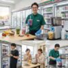 ランチタイムに向けて、セブンイレブンの店員が冷蔵棚に多種多様な弁当を丁寧に補充している様子。